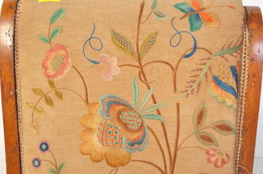 A 19th century Victorian Aesthetic period mahogany nursing chairs with back rest and seat upholstered in an embroidered fabric with braiding along the edge. The mahogany frame having scrolled feet and arm rest united by a turned wood spindle stretcher. Measures 78 x 51 x 76cm.