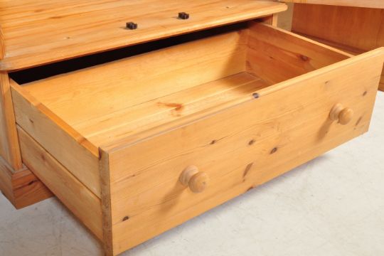 A 20th century vintage country pine bedroom suite comprising of double door wardrobe. dressing table with stool, a chest of drawers and a pair of bedside cabinets. Measures 181 x 91 x 59cm.