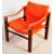 A mid 20th Century Maurice Burke Arkana Safari chair / armchair. Upholstered in  faux red leather upholstery raised on ebonised wooden supports joined by steel stretchers.