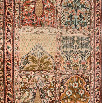 A vintage 20th century Persian silk thread rug. The rug having six central square panels with naturalistic floral designs within. Surrounded by a floral and geometric border and tassels to each end. Machine spun. Measures 130cm x 77cm.