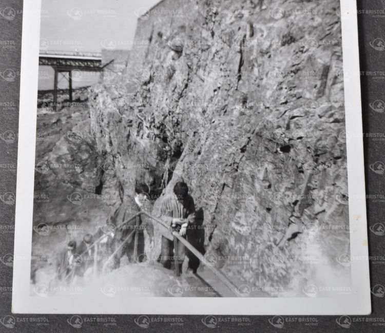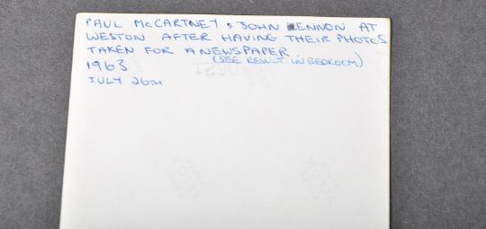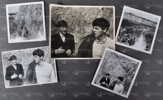 The Beatles - Weston Super Mare - July 1963 - a collection of x5 candid photographs of The Beatles during their time in Weston Super Mare (near Bristol), on July 26th 1963. Taken by the vendor, the images show The Beatles having their photograph taken alongside Birnbeck Pier (a well known photograph of the group) and leaving the beach thereafter.In detail, the images comprise:3.5" x 3.5" photograph showing Paul McCartney and John Lennon leaving the rocks, McCartney with his jacket over one shoulder, having just removed it for the famous photograph. Annotated to rear by vendor at the time.x2 further enlargements (from the period) of this photograph, both cropped. One annotated to reverse by vendor at the time.3.5" x 3.5" photograph of all members walking the stone steps up the rocks after having their picture taken. The photographer can be seen at the end of the line. Annotated to the rear by the vendor at the time. 3.5" x 3.5" wide-shot photograph showing Birnbeck Pier and The Beatles in the lower left corner preparing for the famous photograph. Three of the band appear to be looking at the camera. Annotated to the rear by the vendor at the time. The photographs represent a unique snapshot of The Beatles during their time in Weston Super Mare, where they played twice-nightly for six days in 1963. The photographs were taken personally by the vendor at the time. The photographs are offered with full copyright (buyer to arrange the relevant forms) although the original negatives have been lost / destroyed.From the Sandra Woodruff (née Blaken) collection