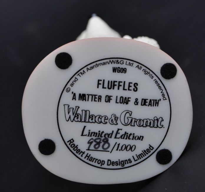 Wallace & Gromit - Robert Harrop - WG09 ' Fluffles - A Matter Of Loaf & Death '. Limited to 1000. Highly detailed resin figure / statue from the classic Aardman Animations made film. Figure appears mint and undamaged. Within original box.Note; from a large collection of Robert Harrop & other statues / figurines. Condition is stated within each description, however buyers are reminded that such statements are not forensic reports and all items will remain sold 'as is'. As a rule, statues do appear mint and undamaged, but this is not guaranteed. Boxes range in condition, and some have wear from storage. In all instances buyers are required to satisfy themselves. Certificates / paperwork are present if photographed, if there are no photographs of certificates then one isn't present.