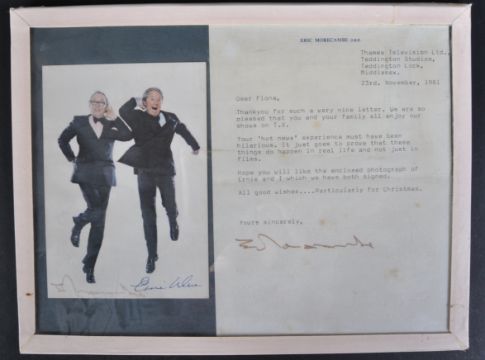 Morecambe and Wise - Eric Morecambe (1926-1984) and Ernie Wise (1925-1999) - Legendary British Comedy Duo - an autographed 6x4" colour photograph of the duo in their iconic pose. Signed to the base. Along with a typed letter from Eric Morecambe, also signed by him. Framed and glazed. Total size approx; 22cm x 29cm.