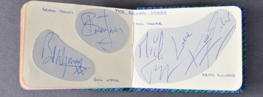 The Beatles & The Rolling Stones - an autograph book containing various signatures of bands from the 1960s, most notably The Beatles and The Rolling Stones. The vendor - a music fanatic at the time - met The Beatles several times, notably in 1963 whilst they played Weston Super Mare. This autograph book was signed at that time, outside The Royal Pier Hotel. The Rolling Stones were obtained when they played Bath Pavillion in November of the same year. In detail, The Beatles autographs comprise:Ringo Starr - signed in blue ink to a left-hand page, dated 26-7-63 by the vendor. No autograph on reverse page.Ringo Starr - second autograph on a left-hand page, dated the same. The first autograph appears a little unclean due to a bad pen. Ringo appears to have noticed this, and then flipped to a page further along and signing in a different pen. No autograph to reverse.George Harrison - signed on a left-hand page and dedicated 'To Sandra'. The vendor has added the date (same as above) and the details of Harrison's car - a Dark Green Mk2 Jag - Reg 29 XPP.  Autograph to reverse of Gerry Marsden of Gerry & The Pacemakers (on the same bill as The Beatles).John Lennon - signed on a right-hand page (opposite Harrison) and dedicated To Sandra. The vendor has added the date and details of Lennon's vehicle - a white Thames Van, Reg No. 6834 KD. No autograph to reverse.Paul McCartney - signed to a right-hand page in blue ink, dedicated 'To Sandra'. Dated by vendor. Another autograph features to the reverse (a member of The Sundowners). The Rolling Stones autographs comprise:A double-page with pasted-in pages from another autograph book, with signatures of Brian Jones, Bill Wyman, Mick Jagger and Keith Richards. Keith and Mick to one page together, and Wyman & Watts pasted-in separately on the other page. Other autographs within the book include;The Big 3, Tommy Quickly, Kevin Kirk, Gerry & The Pacemakers (who were on the same bill with The Beatles), Dec Cluskey of The Bachelors, Del Shannon, and a handful of other identified. A unique autograph album, with a great local connection, and one of the very few examples that feature signatures from the two biggest bands of the 1960s. From the Sandra Woodruff (née Blaken) collection