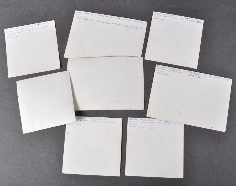 The Beatles - Weston Super Mare - July 1963 - a collection of x8 candid photographs of The Beatles during their stay at The Royal Pier Hotel, Weston Super Mare (near Bristol), on July 26th 1963. Taken by the vendor, the images show The Beatles signing autographs and meeting fans outside the hotel / venue. In detail, the images comprise:3.5" x 5" photograph of John Lennon wearing sunglasses, looking into the lens. Annotated to reverse with location and details. 3.5" x 5" photograph of Paul McCartney alongside a fan.Two 3.5" x 3.5" photographs showing George Harrison departing in his Mk2 Jaguar (one tea stained)3.5" x 5" close-up photograph of Harrison arriving in his Mk2 Jaguar, looking straight at the camera. Annotated to reverse with the details of the car and registration number. 3.5" x 3.5" photograph of George Harrison signing autographs outside The Royal Pier Hotel3.5" x 3.5" closeup photograph of Ringo Starr signing autographs 3.5" x 3.5" photograph showing John Lennon driving 'The Beatles Van', with details annotated to reverse. The photographs represent a unique snapshot of The Beatles during their time in Weston Super Mare, where they played twice-nightly for six days in 1963. The photographs were taken personally by the vendor at the time. The photographs are offered with full copyright (buyer to arrange the correct forms) although the original negatives have been destroyed.From the Sandra Woodruff (née Blaken) collection
