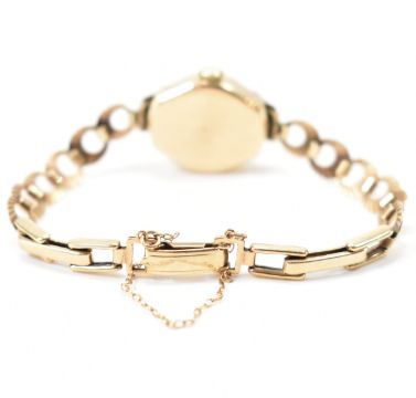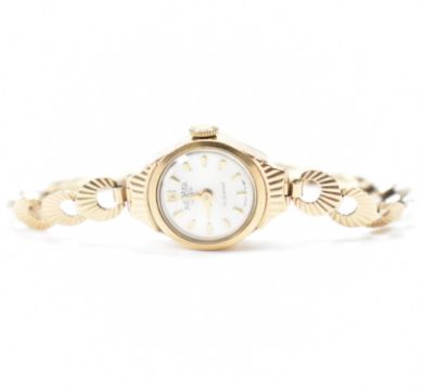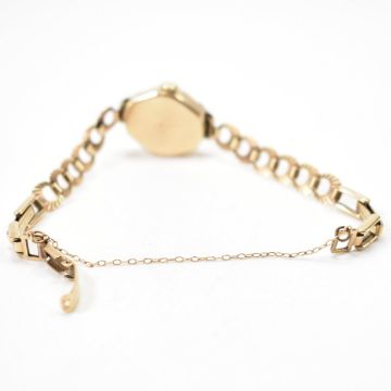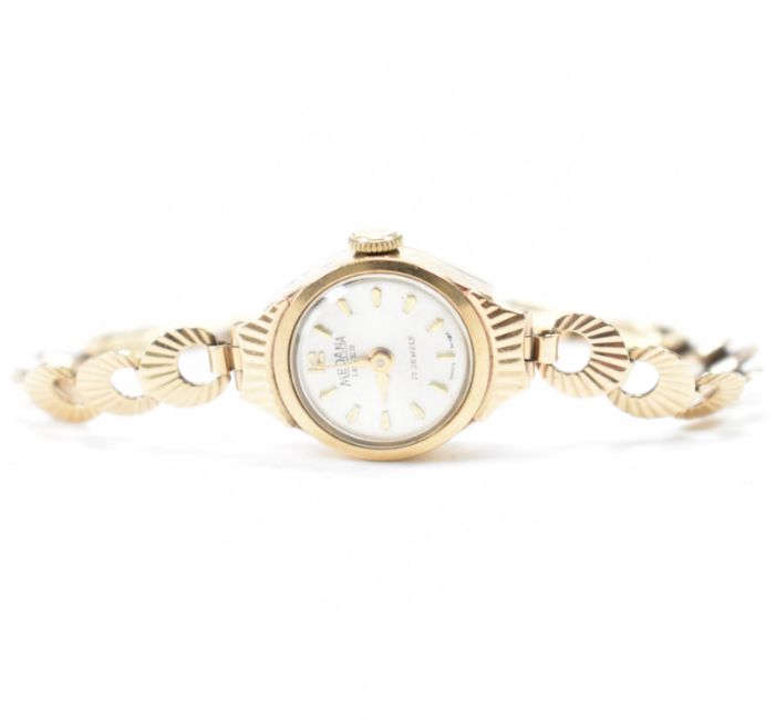 A vintage hallmarked 9ct gold Medana ladies dress watch. The watch having a round face with silvered dial and baton markings to the chapter ring. The watch set within a hallmarked 9ct gold case and on a bracelet strap. Bracelet marked 375, interior of case hallmarked Edinburgh 1963. Gold weight 7.6g.