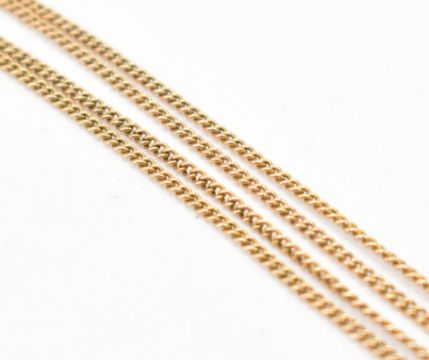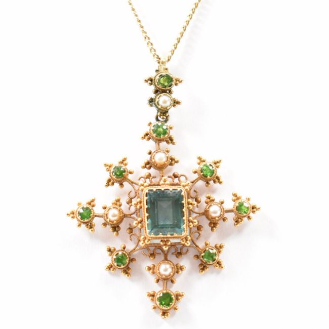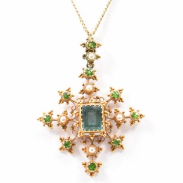 A 19th Century antique gold, tourmaline, demantoid garnet pearl cannetille crucifix  pendant necklace. The pendant being set with a step cut blue tourmaline to the centre within a filigree scrolled mount set throughout with round cut demantoid garnets (some with horsetail inclusions)  and half pearls. Unmarked, tests indicate 14ct gold. Strung upon a later gold chain, tests indicate 9ct gold. Pendant measures 4.6cm. Chain measures 15 inches. Weight 8.5g.