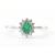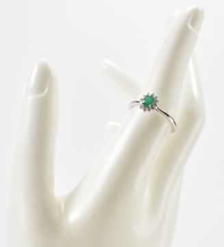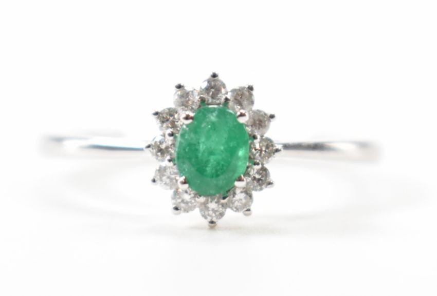 A platinum, emerald and diamond ring. The ring being set with an oval cut emerald with a halo of diamonds. Hallmarked Sheffield. Weight 3.2g. Size O. Emerald measures 5 x 4 mm.