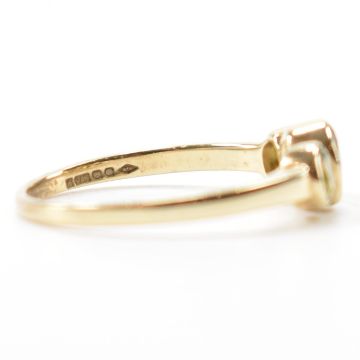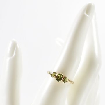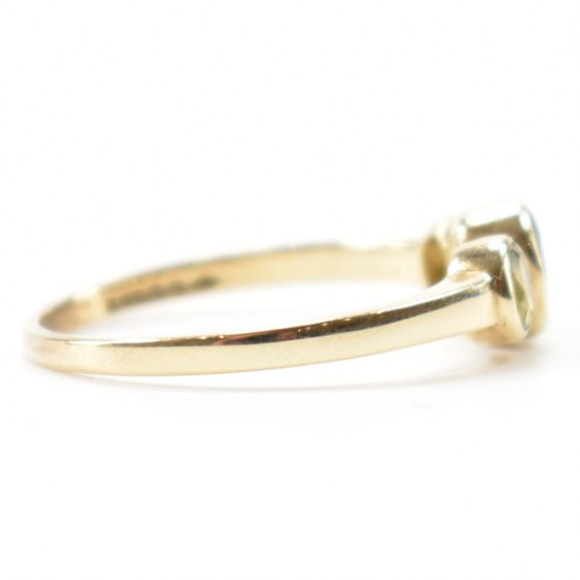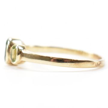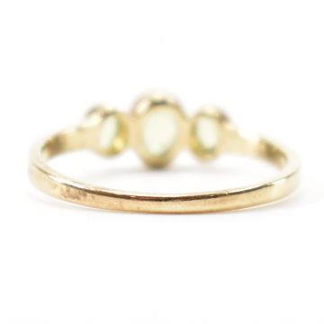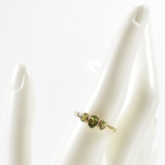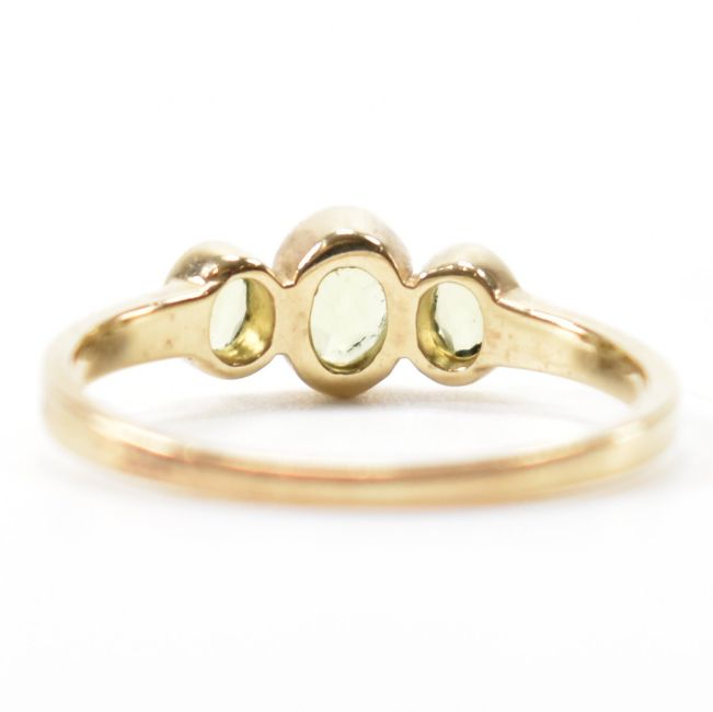 A hallmarked 9ct gold and peridot three stone ring. The ring being bezel set with three oval cut peridot stones. Hallmarked Sheffield 1998. Weight 2.3g. Size S.5.