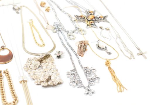 A collection of vintage costume jewellery necklaces. The lot to include rhinestone necklaces, collar necklaces, a rhine stone necklace and bracelet jewellery suite, yellow metal necklace chains and some bracelets and pendants.