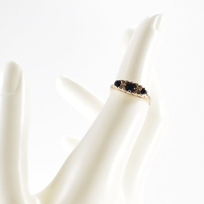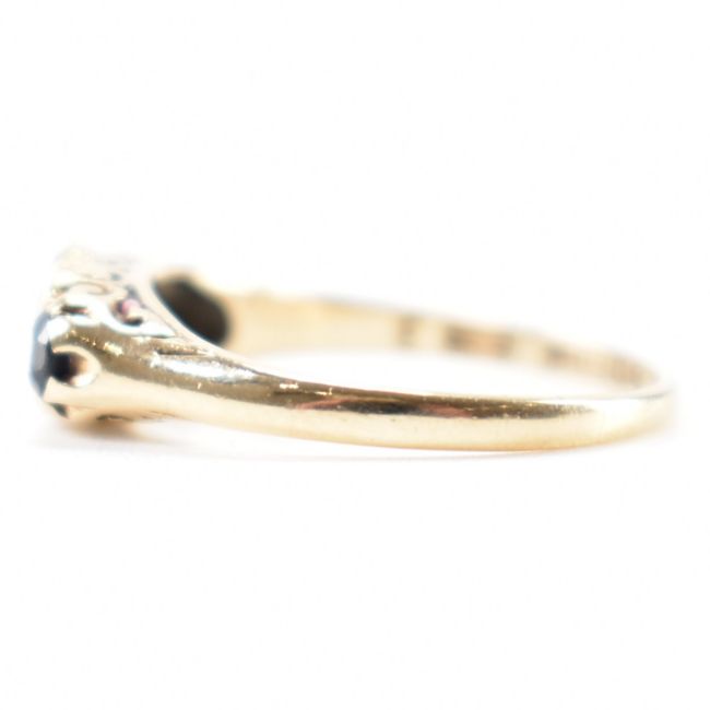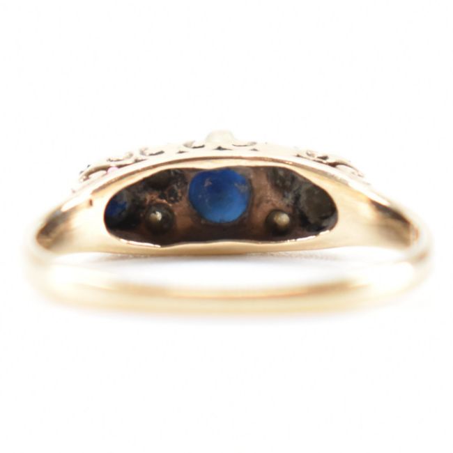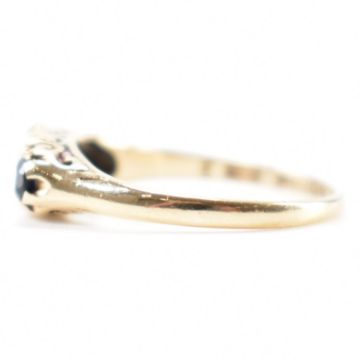 A hallmarked 9ct gold sapphire and diamond three stone ring. The ring having a central round cut sapphire flanked by two diamond accents and a further two smaller sapphires, within a scrolled setting. central sapphire measures approximately 4mm x 4mm. Assay marked for Birmingham. Date letter c for 1977. Makers marks ineligible. Ring size K / K.5. Total weight 1.9g.