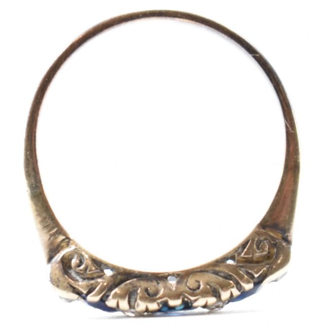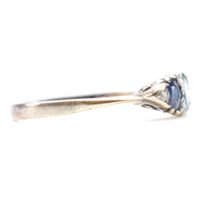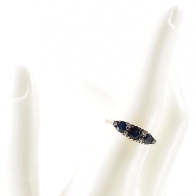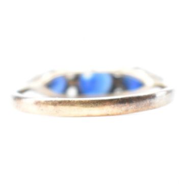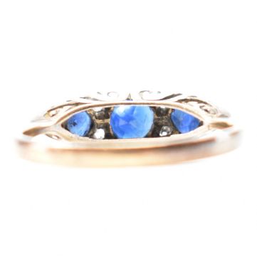 A vintage 9ct gold ring set with three sapphires & diamond accents. The ring having a central sapphire flanked by diamond accents and a further two smaller sapphires, within a scrolled setting. Band unmarked, test indicates 9k. Weighs; 2.6 grams. Size; R.5.