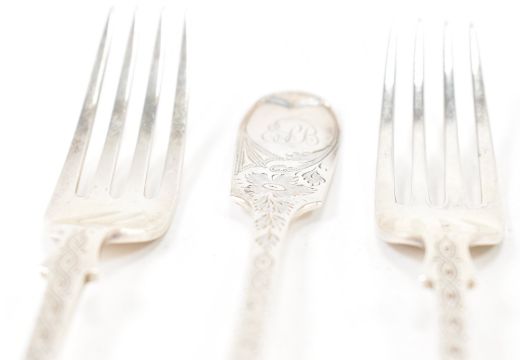 A set of six Edwardian antique silver hallmarked fiddle pattern forks. The fork all having engraved floral detailing with initials engraved to the terminal. Hallmarked London 1904, sponsors marks for Charles T Maine. Measures 16.5cm. Weight 240.5g.
