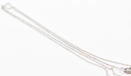 An 18ct white gold and diamond pendant necklace. The necklace having a fine link chain with a flower head pendant set with seven round brilliant cut diamonds. Estimated 0.42ct in total. Chain marked 750 to the jump link. Pendant diameter 7mm.
