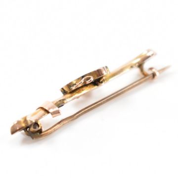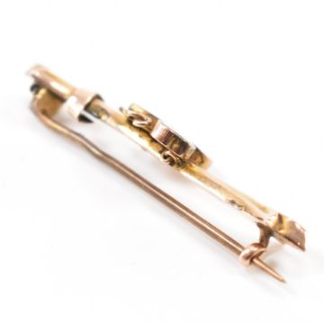 An early 20th Century Edwardian hallmarked 9ct gold sham rock bar brooch. The brooch being set with three heart shaped green stone leaves. Hallmarked Birmingham 1907. Together with a rose gold stick pin set with turquoise cabochons. Unmarked, tests indicate 9ct gold. Weight 3.9g. Measures 5cm and 4cm.