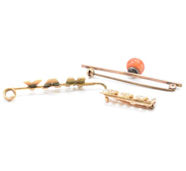 A group of three 19th Century Victorian gold brooches. The lot to include an 1888 brooch set throughout with seed pearls, a bar brooch set with a coral bead to with a diamond to the centre (marked 9ct) and a brooch with the name MAY to the centre and set throughout with seed pearls (AF). One marked 9ct, two unmarked but test as 9ct gold. Measures 4.5cm, 4.7cm and 2.5cm wide. Weight 7.3g.