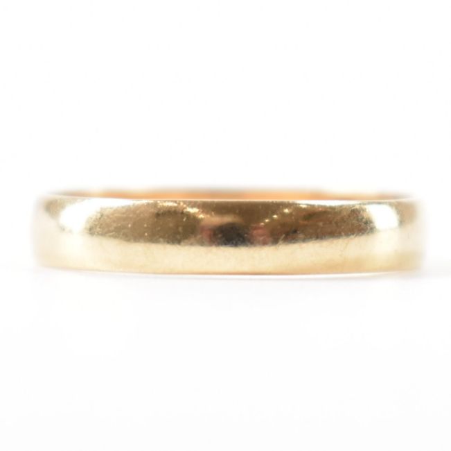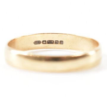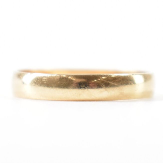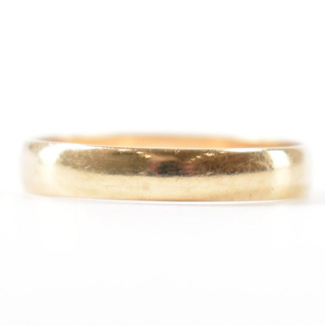 A hallmarked 9ct gold band ring. The ring of plain form. Hallmarked Birmingham 1982. Weight 1.6g. Size R.5.