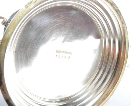 A silver salver tray being with scalloped edge bearing notation to centre for Daventry & District Golf Club 1932 marked for Robert Pringle & Sons. Together with a silver plated wine bottle holder marked for CT & Co, Mappin & Webb scalloped edge bowl and an Elkington & Co bowl