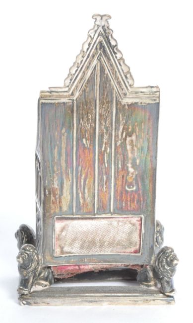 An Edwardian silver pin cushion hallmarked for Horton & Allday, Birmingham 1901. The cushion in the form of the Coronation Throne having an arched back and on oblong base with cast lions at each corner. Measures 7cm high. Total weight 305g.