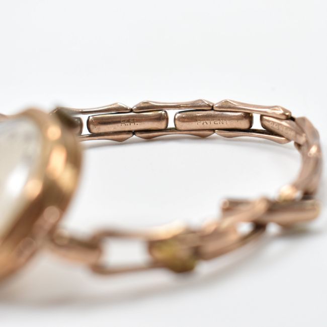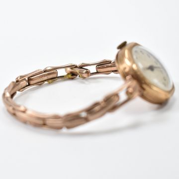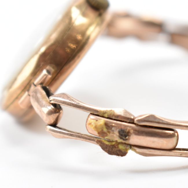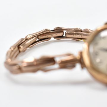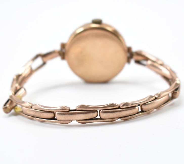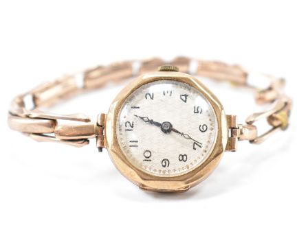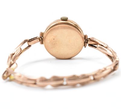 An early 20th Century antique 9ct gold wrist watch. The watch having a round face with arabic numerals to the chapter ring. Interior of the case marked 375, strap marked 9ct E. Gross weight 19.1g. Case measures 27mm.