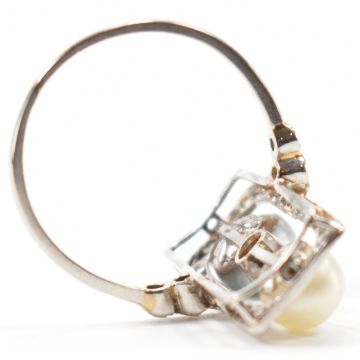 An early 20th Century French 18ct gold, diamond and pearl panel ring. The ring being set with two pearls to the centre with a round old cut diamond to the centre, with pearls set above and below and further diamond accent stones to the mount. French eagle mark partially visible to exterior of band, tests indicate gold. Panel measures approx 19mm. Weight 4.2g. Size O.5.