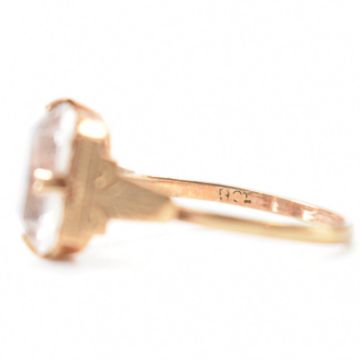 A gold and white stone dress ring. The ring having a central emerald cut white stone within a claw setting upon engraved stepped shoulders. Marked 9ct. Ring size Ring size M / M.5.Total weight 2.2g.
