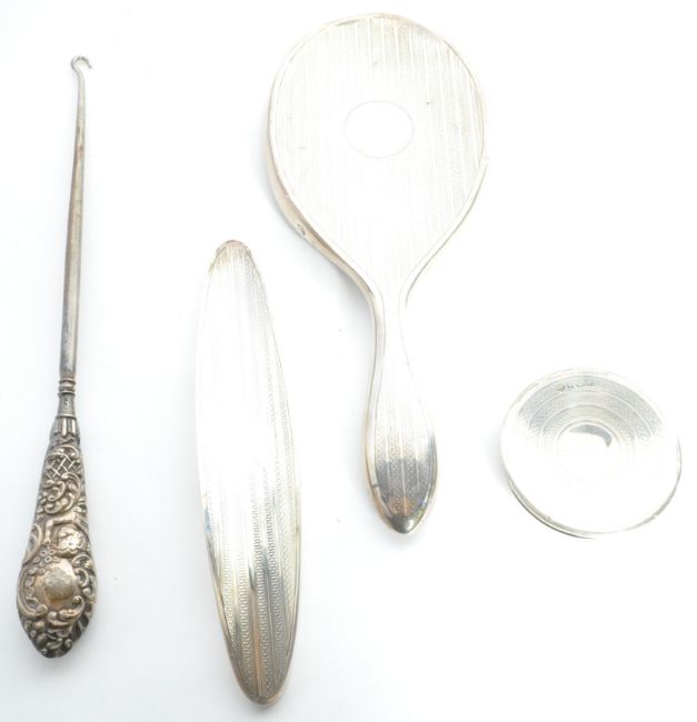 A silver hallmarked dressing table mirror by Martin Hall & Co, Sheffield 1923. Together with a silver hallmarked brush top matching the mirror, dressing table silver pot lid top hallmarked Birmingham and a silver hallmarked handled button hook. Weight of lids x2 only 84.2g