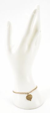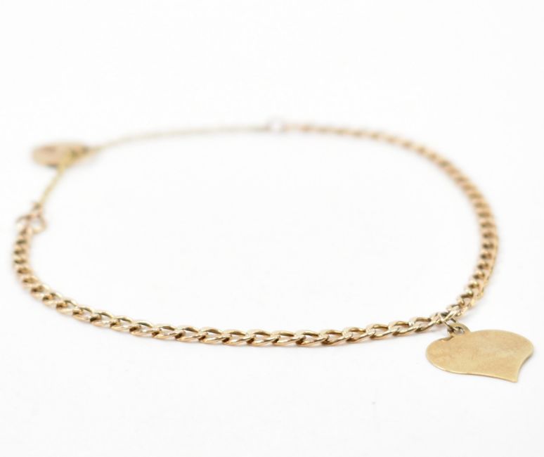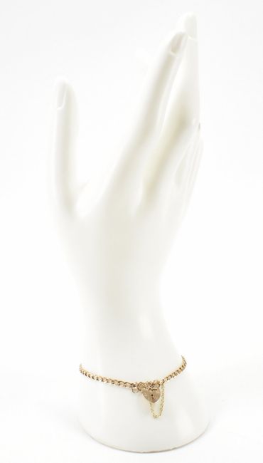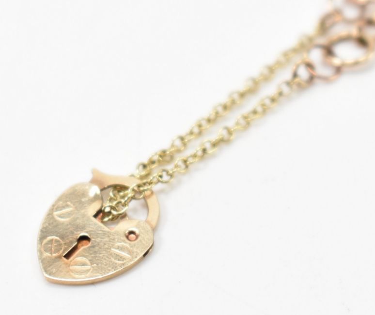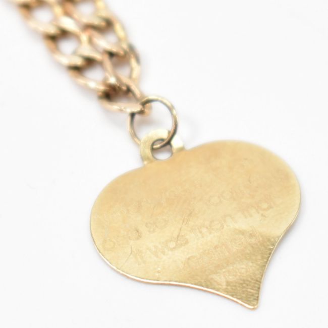 A vintage gold chain bracelet with heart padlock and heart shaped charm with writing to verso 'When you saw only one set of footprints it was then that I carried you' and safety chain. Clasp and heart padlock marked 375. Measures 20cm length. Total weight 2.5g.