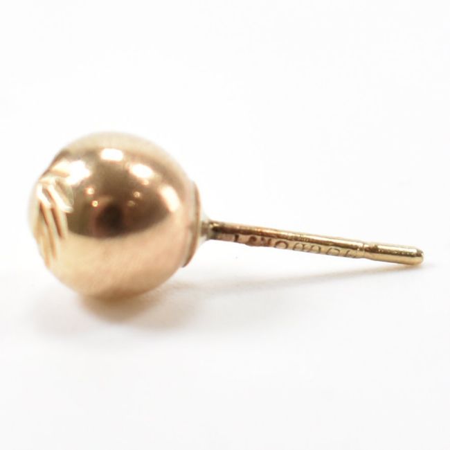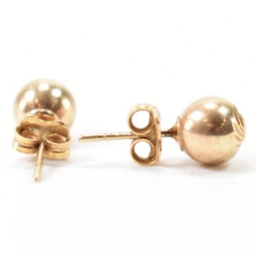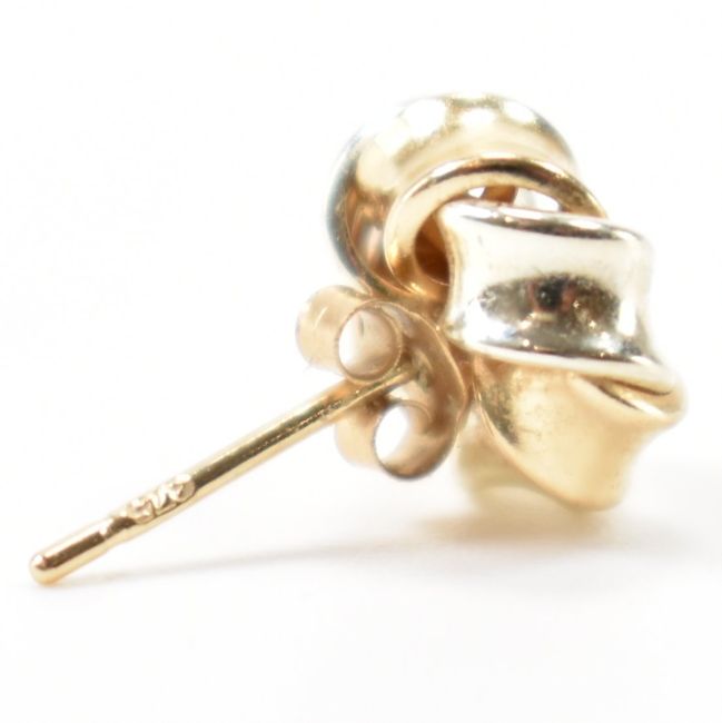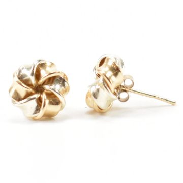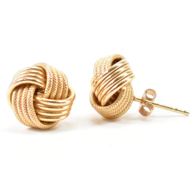 A assortment of three pairs of gold stud earrings to include a two pairs of knot head earrings and a pair of ball head studs. All marked 375 to posts. Heads of largest pair measures 12mm diameter. Total weight 4g.