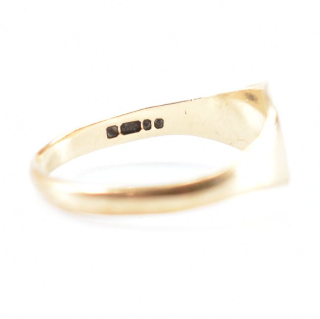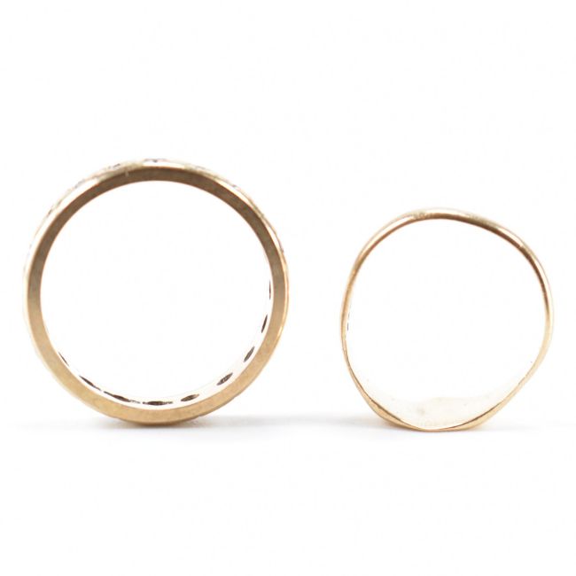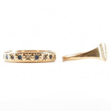 Two hallmarked 9ct gold rings to include a signet pinkie ring with incised star detail to head and an eternity ring set with round cut blue and white stones. Signet assay marked for London. Date letter c for 1977. Makers marks HC&S. Ring size K & E. Eternity ring marks ineligible. Total weight 3.3g.