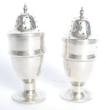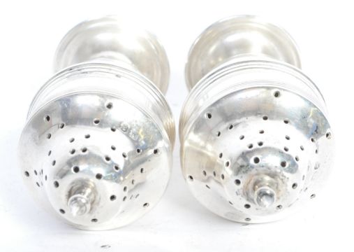 A pair of silver hallmarked condiments  - pepperettes. Each with pierced finial tops. Hallmarked for Chester, date letter italic H for 1908, sponsors mark for Herbert Edward Barker & Francis Ernest Barker  - Barker Brothers. Total weight 52.7g