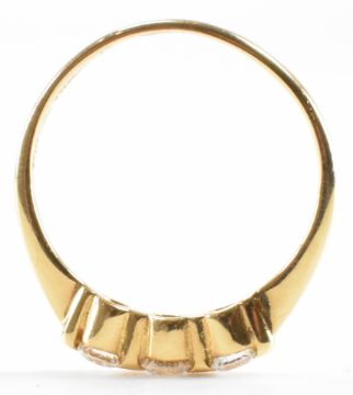 A gold and diamond three stone ring. The ring being set with three round brilliant cut diamonds. The shank marked 750 for 18ct, 0.25. Weight 1.7g. Size I.