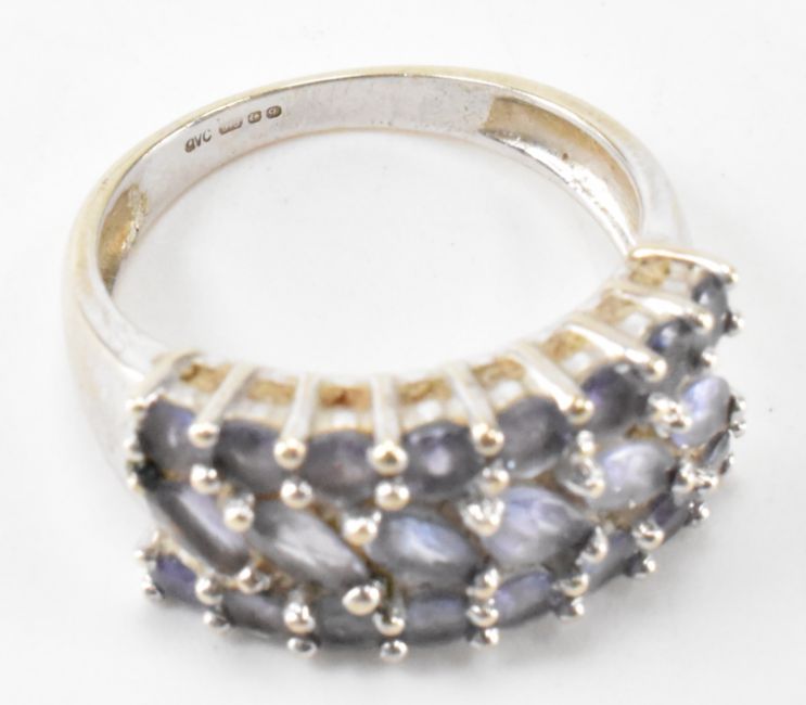 A hallmarked 9ct gold and amethyst cluster ring. The ring having two rows of round mixed cut stones and a central row of marquise cut stones. Hallmarked Birmingham 2006. Weight 3.5g. Size M.5.