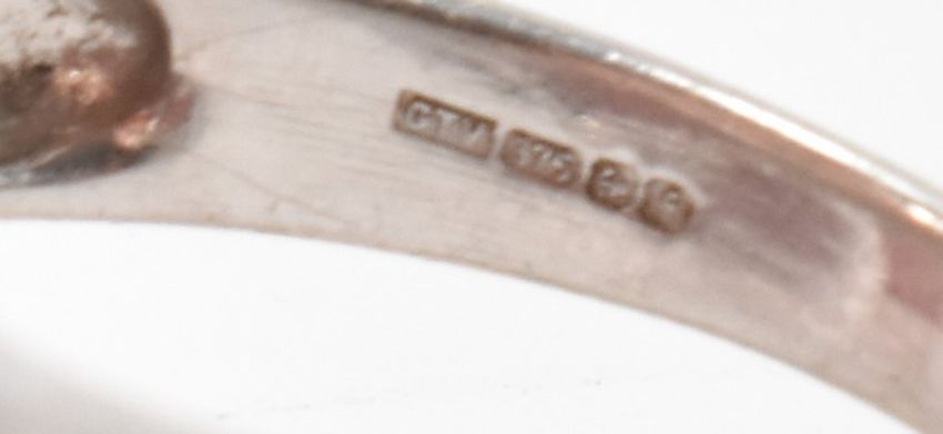A hallmarked white gold and pink quartz ring. The ring being set with an oval cut pink quartz flanked by four green accent stones to the shoulders. Hallmarked Birmingham 2005. Weight 6.3g. Size N.5. Stone measures 14mm x 10.2mm x 8.2mm.