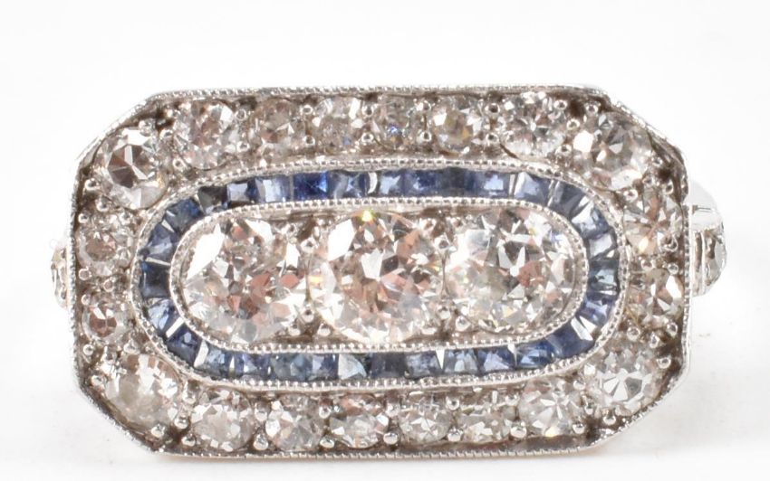 An Art Deco platinum diamond and sapphire panel ring. The ring having a rectangular head pave set throughout with round cut diamonds and a halo of square cut sapphires. Unmarked tests indicate platinum, split to shank. Principle diamond measures 3.5mm diameter, estimated 0.15ct. Head measures 18mm wide. Weight 3.5g. Size L.