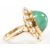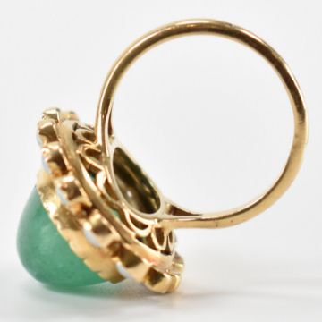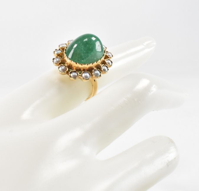 A French 18ct gold, emerald and seed pearl dress ring. The ring having a large oval emerald cabochon with a halo of half pearls on a plain band. French eagle mark to the exterior of the shank,makers mark lozenge to the shank. Size M.5. Weight 9.6g.