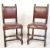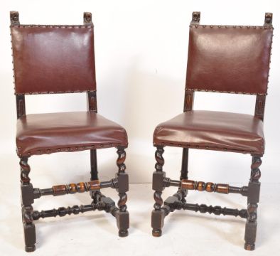 A pair of Edwardian  carved oak and leather dining/living chairs. The chair having carved oak in the shape of a lion on the back rest, studded leather seat, with turned upright supports united by perimeter stretchers. Measures approx.