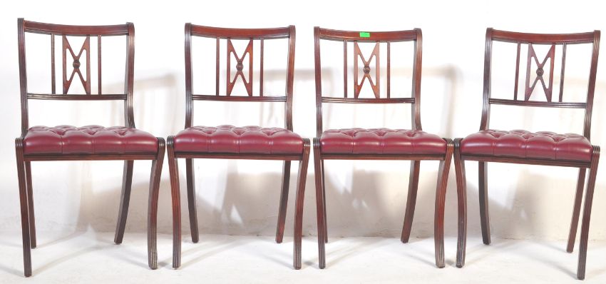 A collection of four Beresford and Hicks Regency Revival mahogany dining chairs having pierced reeded backrests atop a chesterfield buttoned seat raised on sabre supports. Measures 85cm H x 49cm W x 52cm D