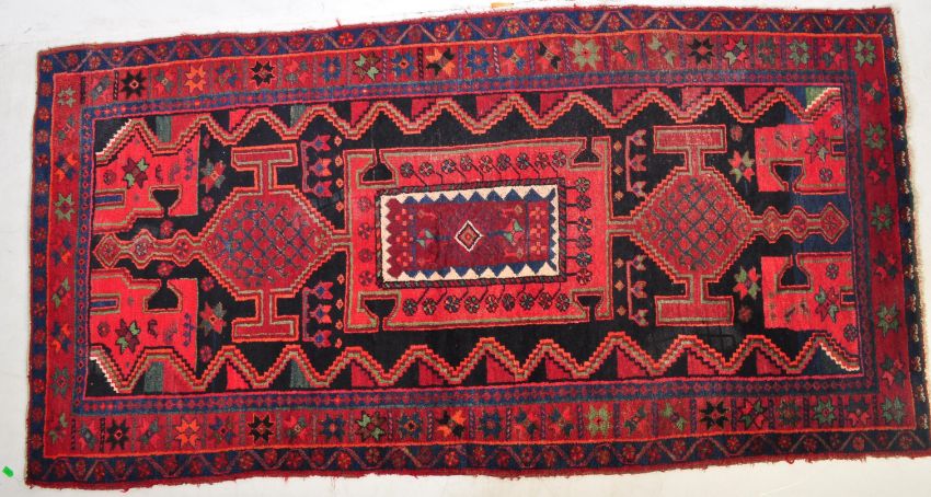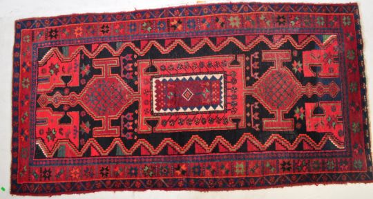 A mid 20th century Turkish rug carpet having a red black and blue ground with star and hexagonal motifs. Measures 280cm x 142cm.