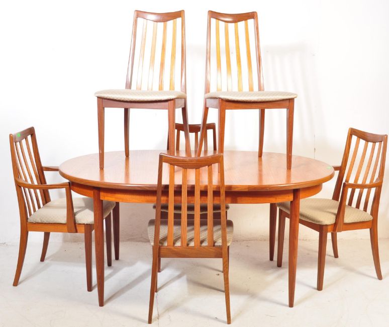 G-Plan - A retro vintage mid 20th century G Plan teak wood extendable dining table. The table having oval top with tapering teak supports. Together with four dining chairs and two carver chairs. Measures 74cm x 162cm x 111cm.