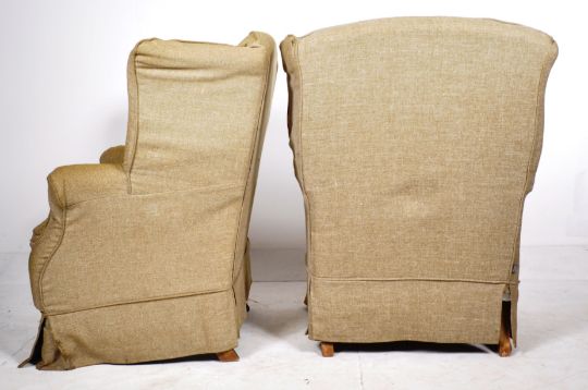 Belgian Modern Design - A pair of contemporary Flamant furniture wingback armchairs / fireside library chairs. Each raised on straight apron covered legs with scroll arms and tall, deep winged back rests with each being upholstered in dark beige cover with plain white fabric underneath. Each measures approx; 110cm x 87cm x 75cm.