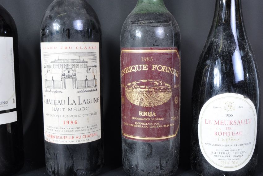 A collection of eight bottles of French, Spanish & Italian red wine comprising 2x 1985 bottle of Clocher De Saint Emilion, 1986 bottle of Chateau La Lagune Haut Medoc, Valdisug 2004 Brunello Di Montalcino, 1985 Enrique Forner Rioja, 1983 Chateau Carbonnieux Grand Cru Classe, 1988 Le Meursault De Ropiteau and a bottle of 2013 Chateau Lagrange Lussac Saint Emilion. All in good condition.