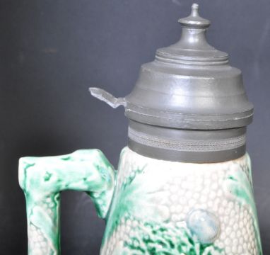 A 19th century Victorian era George Jones Majolica Fox and Dog hunting themed jug. The jug having modelled fox and dog vignettes in relief with handle in the form of a riding crop. George Jones makers stamp and factory mark 5 to the base. Accompanied by an Etruscan GS&H Majolica and pewter jug with cockle shell decoration. Condition: George Jones lid missing and some damage to the relief. Measures 27cm tall.