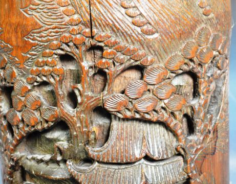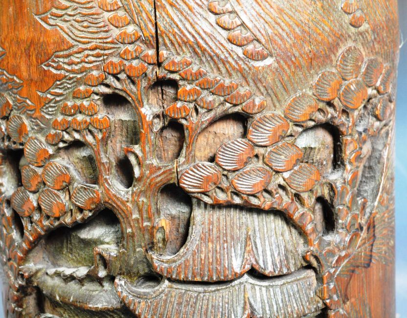 A 19th Century Chinese hand carved bamboo brush pot vase. The brush pot of typical form with scenes of figures playing games, building and carved with leaves. Hole to base. Measures approx; 18cm x 13cm.