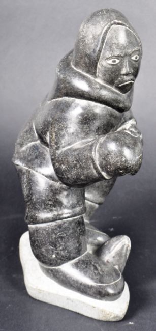 David Irqu Irqumia - A large Inuit art hand carved polished shiny black stone figurine depicting a male figure Inuit fisherman with fish peering from iceflow at his feet. Signed in Roman D Irkok. Measures approx; 27cm x 19cm x 12cm.