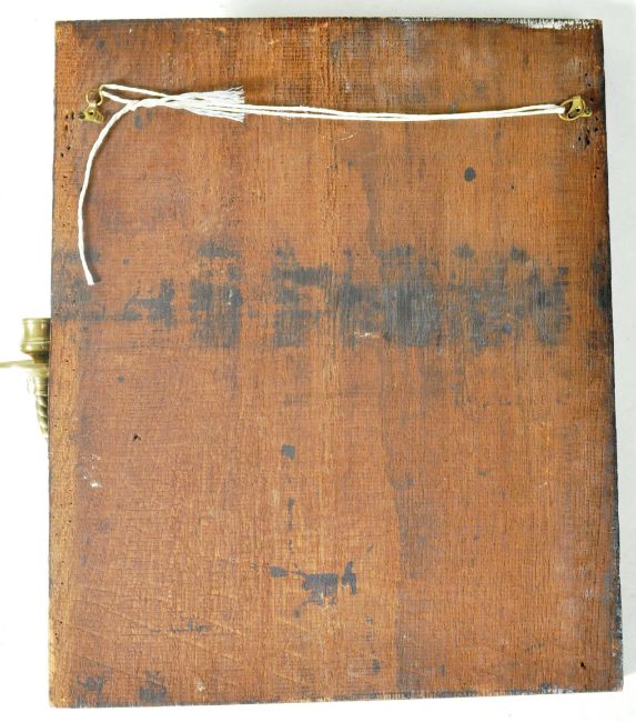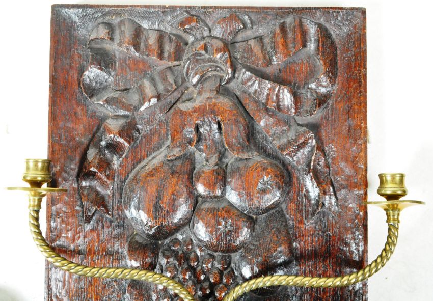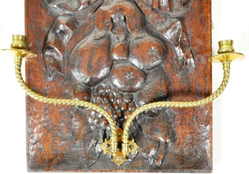 A 19th Century carved wooden panel having a pair of folding brass wall sconces. The square carved back panel decorated with bow and fruit with the twin brass sconces having circular drip trays and sugar twist barley stems. Measures approx; 51cm x 42cm.