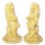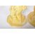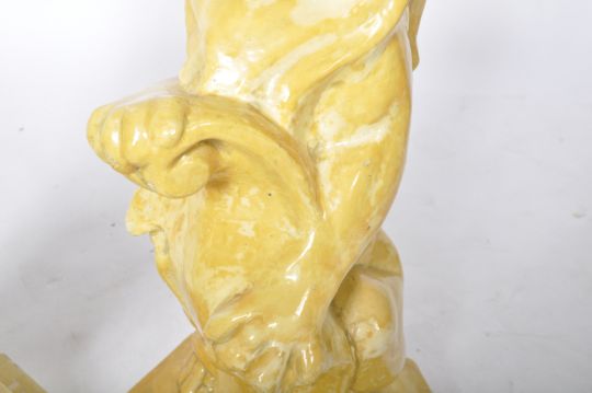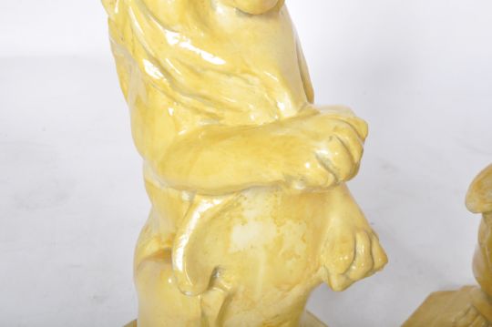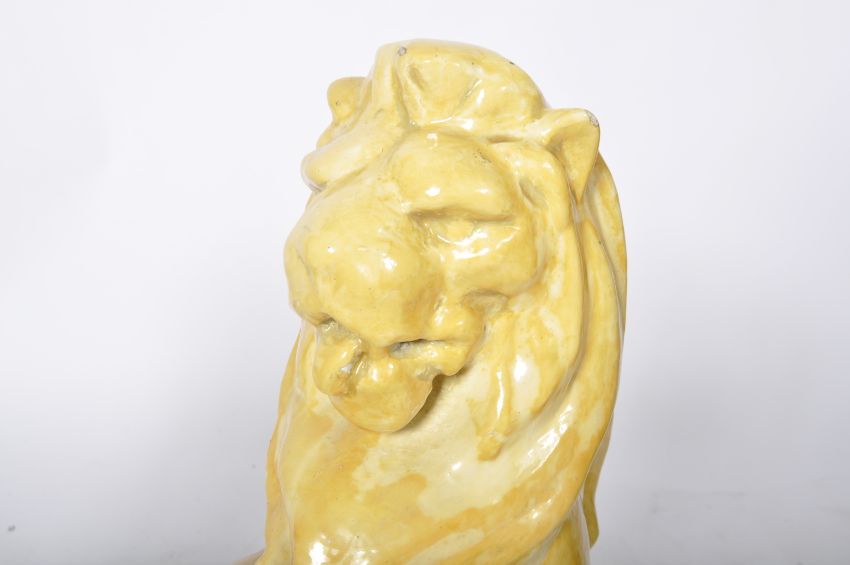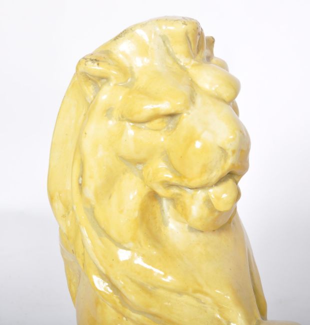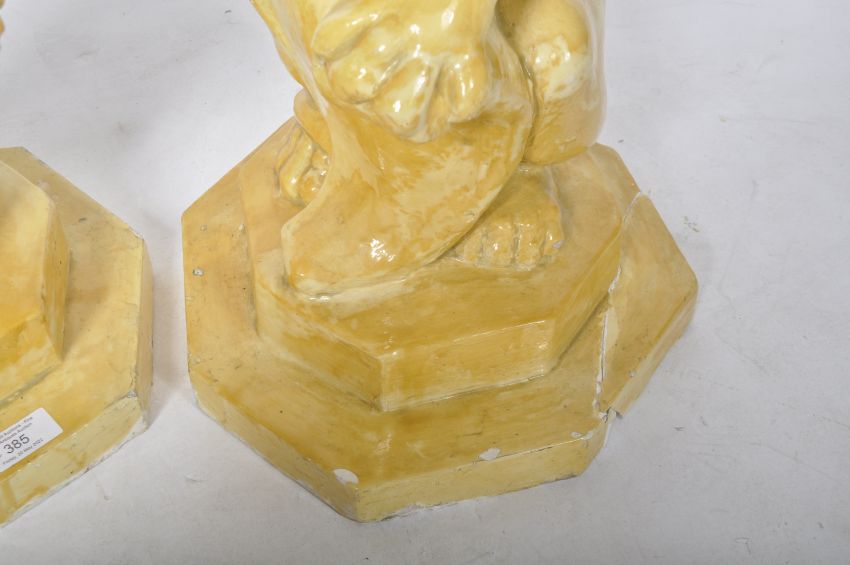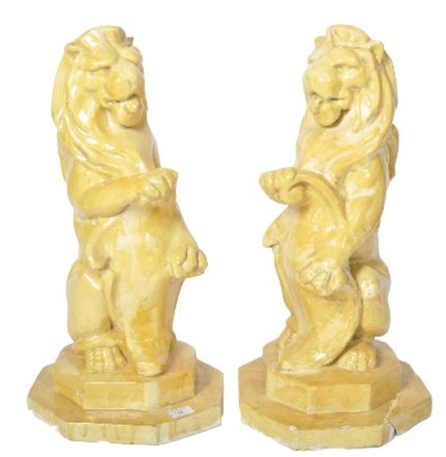 A matching pair of early 20th Century pottery garden figures in the form of seated lions holding shields. Each raised on an octagonal stepped base with both finished in yellow. One base A/F. Each measures approx; 62cm x 30cm diameter.