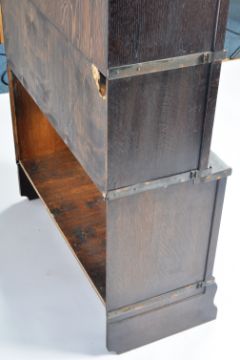 Globe Wernicke - A large early 20th Century oak Eight / 8 stack stacking lawyers / barristers library bookcase display cabinet having eight glazed lift and slide action doors with small knob handles. All being raised on a shaped plinth base with matching pediment top. Label present for Globe Wernicke. Measures approx 267cm x 85cm x 38cm.