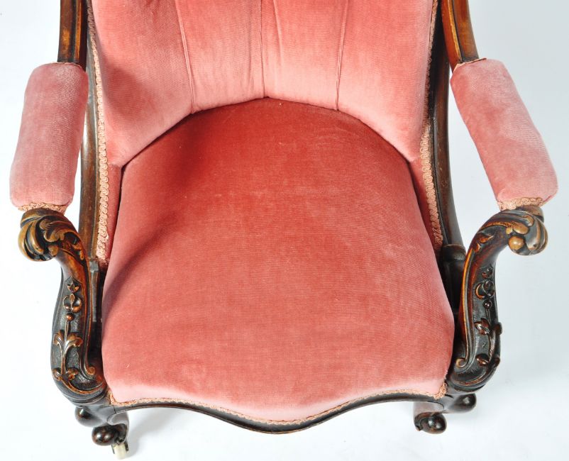 A 19th Century Victorian mahogany library reading club armchair / arm chair. The chair with button back rest with cushioned arms having ornate carved detailing. Overstuffed seat cushion with serpentine frieze all raised on small cabriole legs with white ceramic castors. Measures approx; 94cm x 68cm x 62cm.