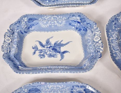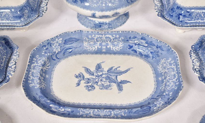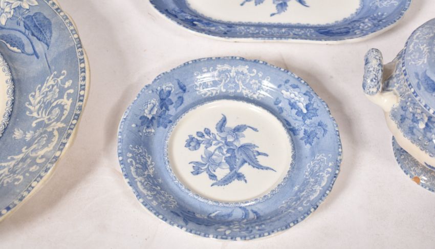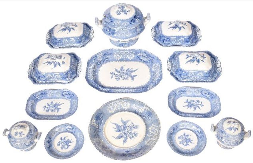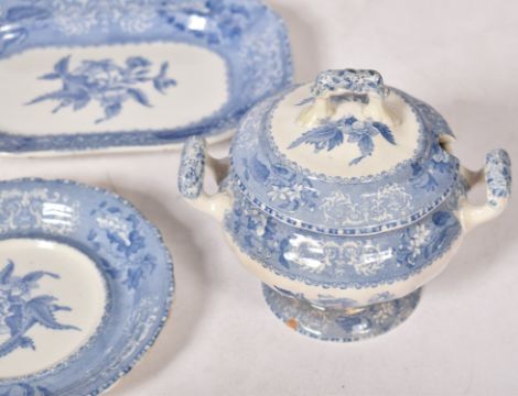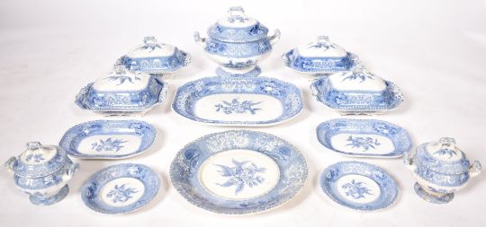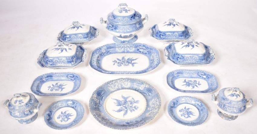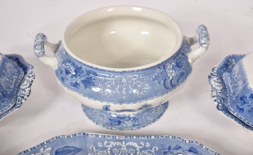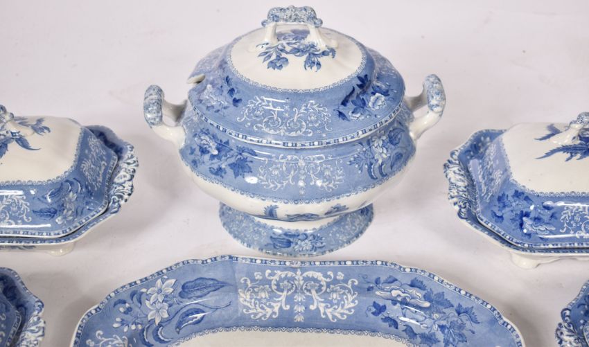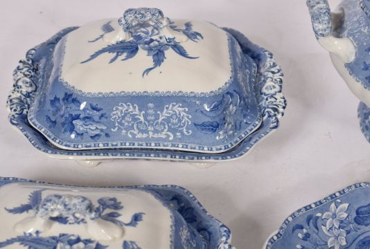 A large extensive 19th Century Victorian blue and white dinner service by spode. Consists of multiple plates in graduating sizes, lidded tureens and more. Each with blue and white transfer printed decoration and makers marks to undersides.